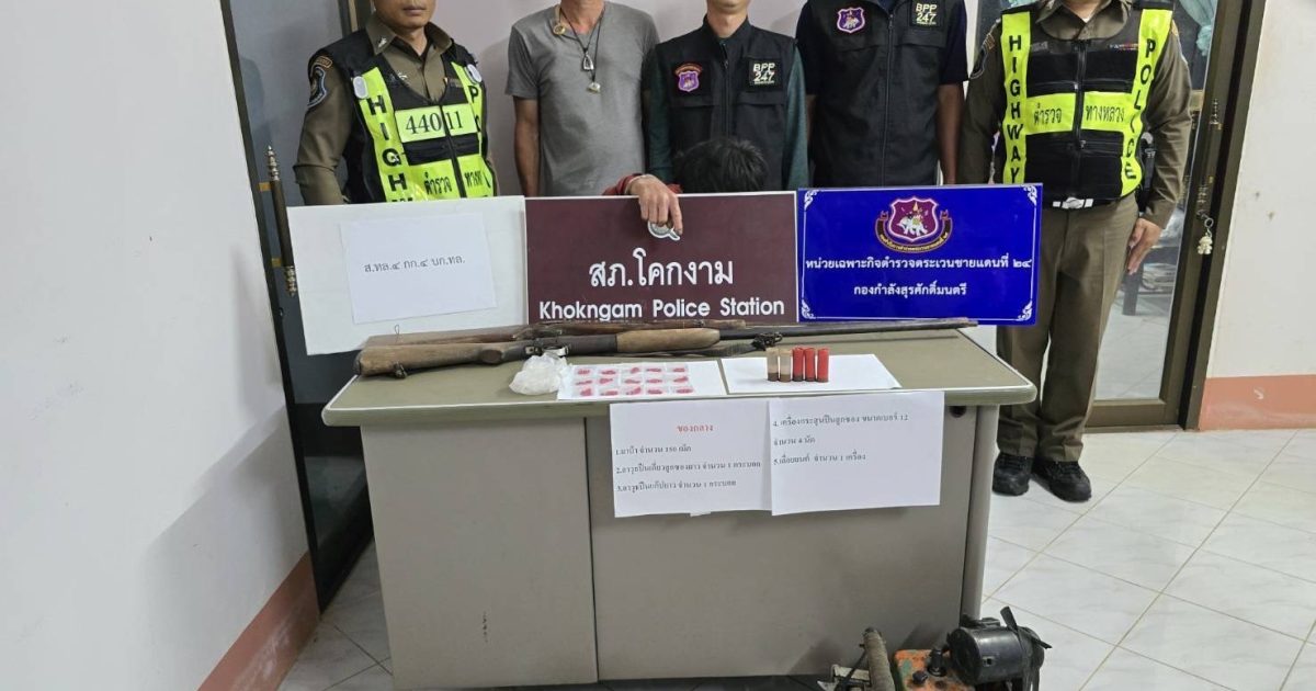ร่วมกันจับกุม นายเอ (นามสมมติ) อายุ 57 ปี ตำบลวังยาว อำเภอด่านซ้าย จังหวัดเลย พบของกลาง ยาบ้า จำนวน 150 เม็ด, อาวุธปืนเดียวลูกซองยาว จำนวน 1 กระบอก, อาวุธปืนแก๊ปยาว จำนวน 1 กระบอก, เลื่อยยนต์ยี่ห้อ STIHL สีส้ม-ขาว พร้อมโซ่และแผ่นบังคับโซ่(บาร์) ขนาดความยาว 33 นิ้ว จำนวน 1 เครื่อง และเครื่องกระสุนปืนขนาดเบอร์ 12 จำนวน 5 นัด