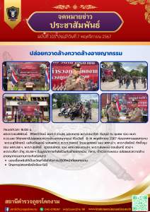 ภ.จว.เลย ให้ทุกสถานีปล่อยแถวกวาดล้างอาชญากรรม ห้วงวันที่ 8-14 พฤศจิกายน 2567 ก่อนเทศกาลลอยกระทง พ.ต.อ.สุวิจักขณ์. เนติเจริญรุจน์ รรท.ผกก.ฯ พ.ต.ท.วรพจน์ วัฒนะสุวรรณ รอง ผกก.ป.ฯ, พ.ต.ท.ชัยรัตน์ ภักดิ์จรุงรอง ผกก.สส.ฯ, พ.ต.ท.สุรสิทธิ์ สุวรรณโคตร รอง ผกก.(สอบสวน)ฯ, พ.ต.ท.สมพงษ์ ดอนอินทร์ สวป.ฯพ.ต.ท.ปรีชา ขำชู สว.สส.ฯ จึงบูรณาการกำลังร่วมกับฝ่ายปกครอง, ทหาร, ตำรวจทางหลวง ปล่อยแถวกวาดล้างอาชญากรรมตามภาระกิจดังกล่าว