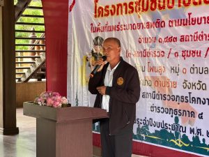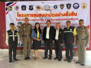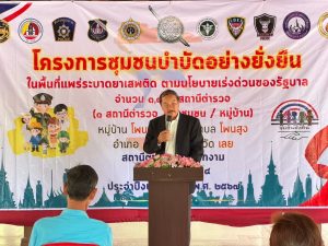 ร่วมกับนายสนอง โสประดิษฐ์ ประธาน กต.ตร.(ประธานในพิธี) นายฤทธิพร พรหมมาวัน กำนันตำบลโพนสูง น.ส.ยุภาพร ทรงภักดี ผอ.โรงเรียนบ้านโพนสูง นายประสิทธิ์ โพธิ์ศรี ผู้ใหญ่บ้านบ้านโพนสูง นายสมชายการส รองนายก อบต.โพนสูง ร่วมพิธีโครงการชุมชนบำบัดอย่างยั่งยืน ในพื้นที่แพร่ระบาดยาเสพติดตามนโยบายเร่งด่วนของรัฐบาล จำนวน ๑,๔๘๓ สถานีตำรวจ (๑ สถานีตำรวจ / ๑ ชุมชน / หมู่บ้าน) ณ หมู่บ้าน โพนสูง หมู่ ๑ ตำบลโพนสูง อำเภอด่านซ้าย จังหวัดเลย พร้อมร่วมกันลงนามเพื่อป้องกันและปราบปรามยาเสพติดในพื้น นำความสงบสุขคืนสู่สังคม