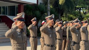 นำข้าราชการตำรวจ สภ.โคกงาม เข้าแถวเคารพธงชาติ กล่าวคำปฏิญาณ ร้องเพลงสรรเสริญพระบารมี และฟังข้อราชการจาก ผู้บังคับบัญชา