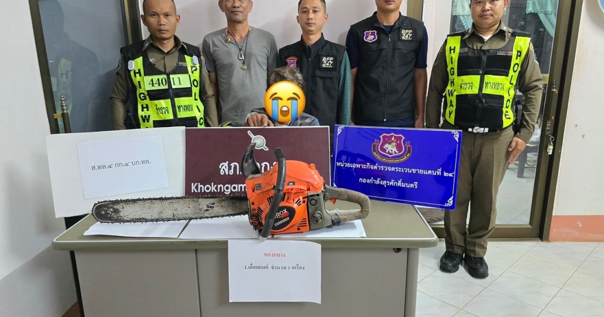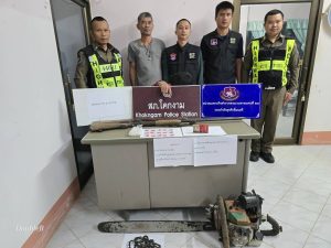 และนายบี (นามสมมติ) อายุ 56 ปี ตำบลวังยาว อำเภอด่านซ้าย จังหวัดเลย พบของกลาง เลื่อยยนต์ยี่ห้อ EUROX CS5800CP สีส้ม ประกอบโซ่และแผ่นบังคับโซ่(บาร์) ขนาดความยาว 22 นิ้ว จำนวน 1 เครื่อง