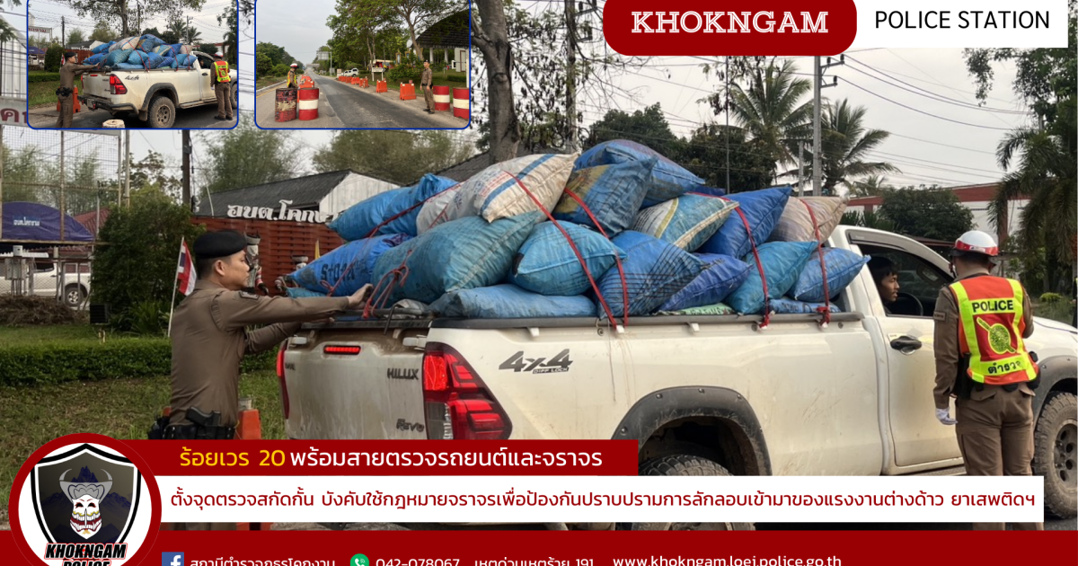 ร.ต.อ.จีระศักดิ์ สิทธิสาร รอง สวป.สภ.โคกงาม ปฏิบัติหน้าที่ร้อยเวร 20 ได้เรียกชุดสายตรวจจักรยานยนต์ ณ จุดตรวจบริการประชาชนโคกงาม เพื่อตรวจอุปกรณ์ประจำกาย ฝึกทบทวนยุทธวิธี และชี้แจงภาระกิจก่อนปฎิบัติหน้าที่ในพื้นที่รับผิดชอบ พร้อมปล่อย สายตรวจรถยนต์และจราจร สภ.โคกงาม ออกปฏิบัติหน้าที่ ดำเนินตามแผนสกัดกั้น ตั้งแต่เวลา 06.00 – 09.00 น. เพื่อป้องกันปราบปรามการลักลอบเข้ามาของแรงงานต่างด้าว ยาเสพติด ควันดำ อาวุธปืน ผู้มีอิทธิพล และการกระทำผิดกฎหมาย ตั้งจุดตรวจสกัดกั้น บังคับใช้กฎหมายจราจร ตามแผนนโยบาย เครือข่ายใยแมงมุมุดตรวจจุดบริการประชาชนโคกงาม ( ภูเรือ – ด่านซ้าย) ต.โคกงาม อ.ด่านซ้าย จ.เลย