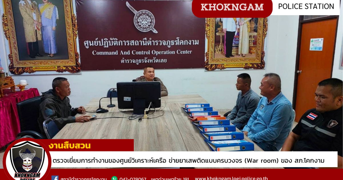 พ.ต.อ.ยุทธวัฒน์ โชคชัย รอง ผบก.ภ.จว.เลยเดินทางมาตรวจเยี่ยมการทำงานของศูนย์วิเคราะห์เครือ ข่ายยาเสพติดแบบครบวงจร (War room) ของ สภ.โคกงาม โดยมีการจัดทำฐานข้อมูลผู้ค้ารายสำคัญ ผู้เสพ ผู้ป่วยจิตเวช อีกทั้งได้มีการทำแผนที่จัดทำแผนที่แพร่ระบาดของยาเสพติดในพื้นที่ของ สภ.โคกงามพร้อมทั้งให้คำชี้แนะแนวทางในการปฏิบัติหน้าที่แก่เจ้าหน้าที่ตำรวจ สภ.โคกงามโดยมีพ.ต.ท.ชัยรัตน์ ภักดิ์จรุง รอง ผกก.สส.สภ.โคกงาม , พ.ต.ท.สุรสิทธิ์ สุวรรณโคตร รอง ผกก (สอบสวน) สภ.โคกงาม พร้อมด้วย ข้าราชการตำรวจในสังกัด สภ.โคกงาม ร่วมให้การต้อนรับ ณ ห้อง ศูนย์วิเคราะห์เครือข่ายยาเสพติดแบบครบวงจร (War room) สภ.โคกงาม ภ.จว.เลย