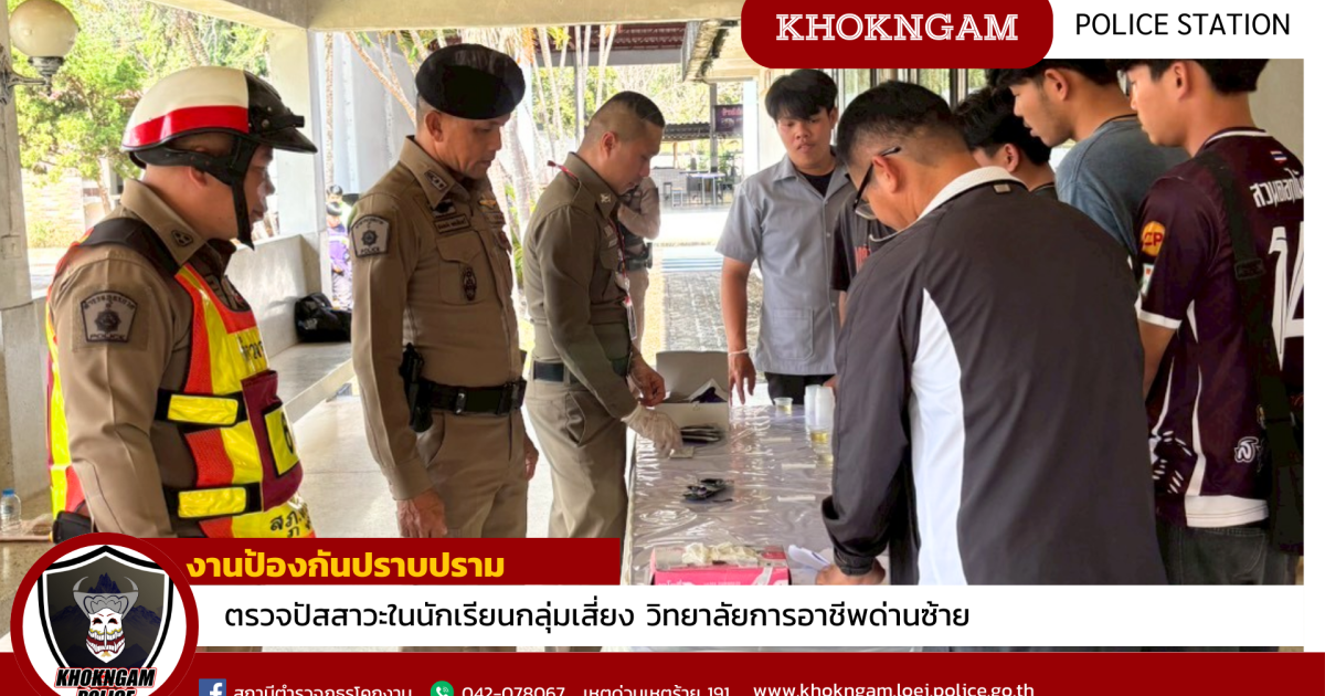 พ.ต.อ.สัมฤทธิ์ สิมสวัสดิ์ ผกก.สภ.โคกงาม มอบหมายให้ พ.ต.ท.สมพงษ์ ดอนอินทร์ สวป.สภ.โคกงาม พร้อมชุดสายตรวจ และชุดสืบสวน ทำการเข้าตรวจปัสสาวะนักเรียนวิทยาลัยการอาชีพด่านซ้าย อ.ด่ารซ้าย จ.เลย ระดับชั้น ปวช. และปวส. เพื่อหาสารเสพติดในกลุ่มนักเรียน ผลการตรวจปรากฏว่า นักเรียนทุกคนมีผลการตรวจเป็นลบ ไม่พบสารเสพติดแต่อย่างใด